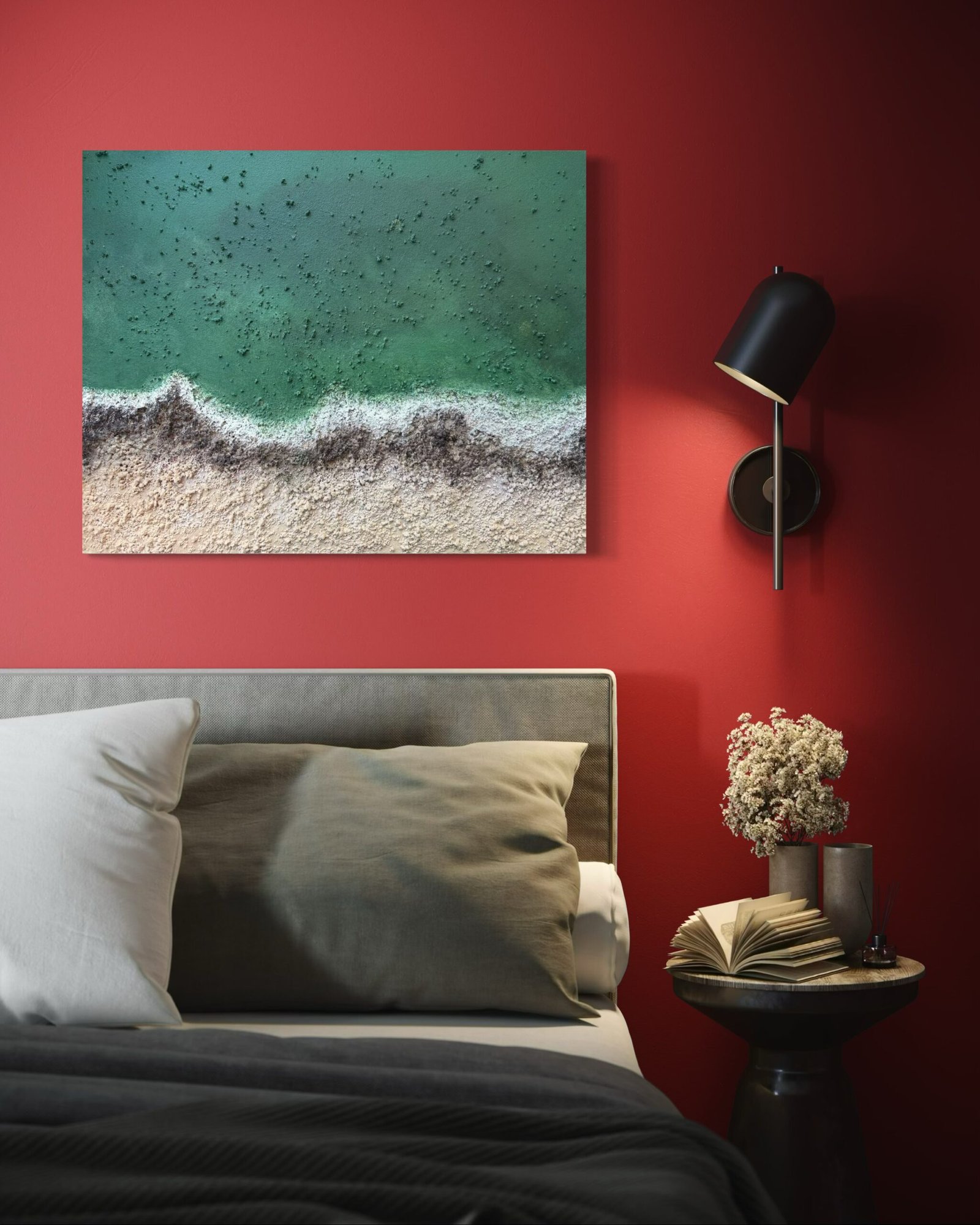 La fuerza del mar se encuentra con la calma de la arena en un instante suspendido. Las texturas recrean el movimiento de la espuma al romper en la orilla, mientras los verdes profundos evocan la inmensidad del océano.